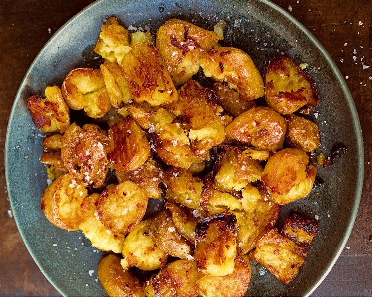 Start by boiling or steaming your potatoes. When they are approaching fork tender, pull them out and smash each one. Don’t mash them, just crush each potato until it just starts to crack.